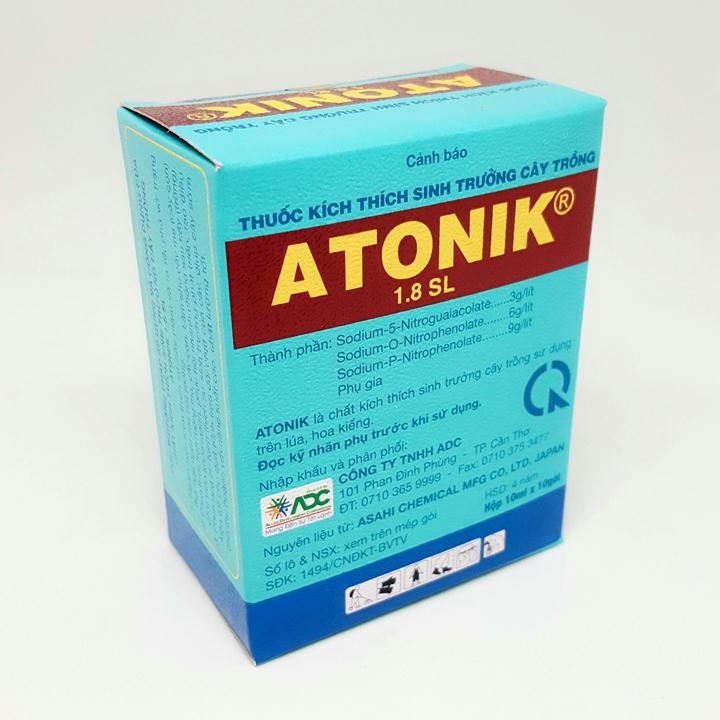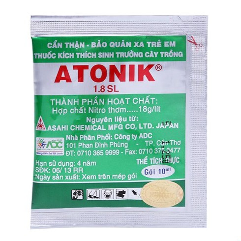 Phân bón lá kích thích tăng trưởng cây trồng ATONIK 1.8 SL hộp 10 gói.Thành phần: Sodium - S - Nitrogualacolate 0,03 + Sodium - O - Nitrophenolate 0,06 % + Sodium - P - Nitrophenolate 0,09 %