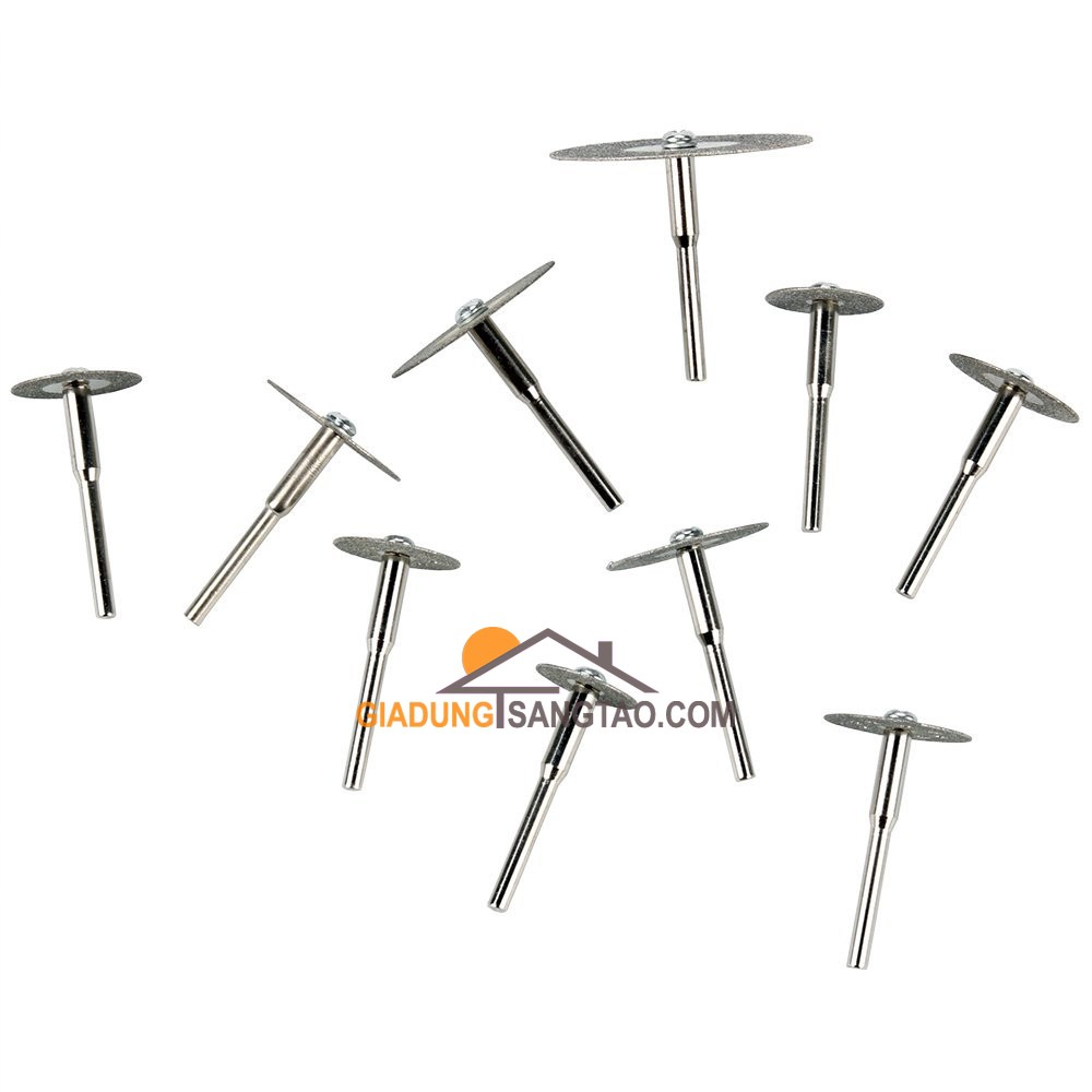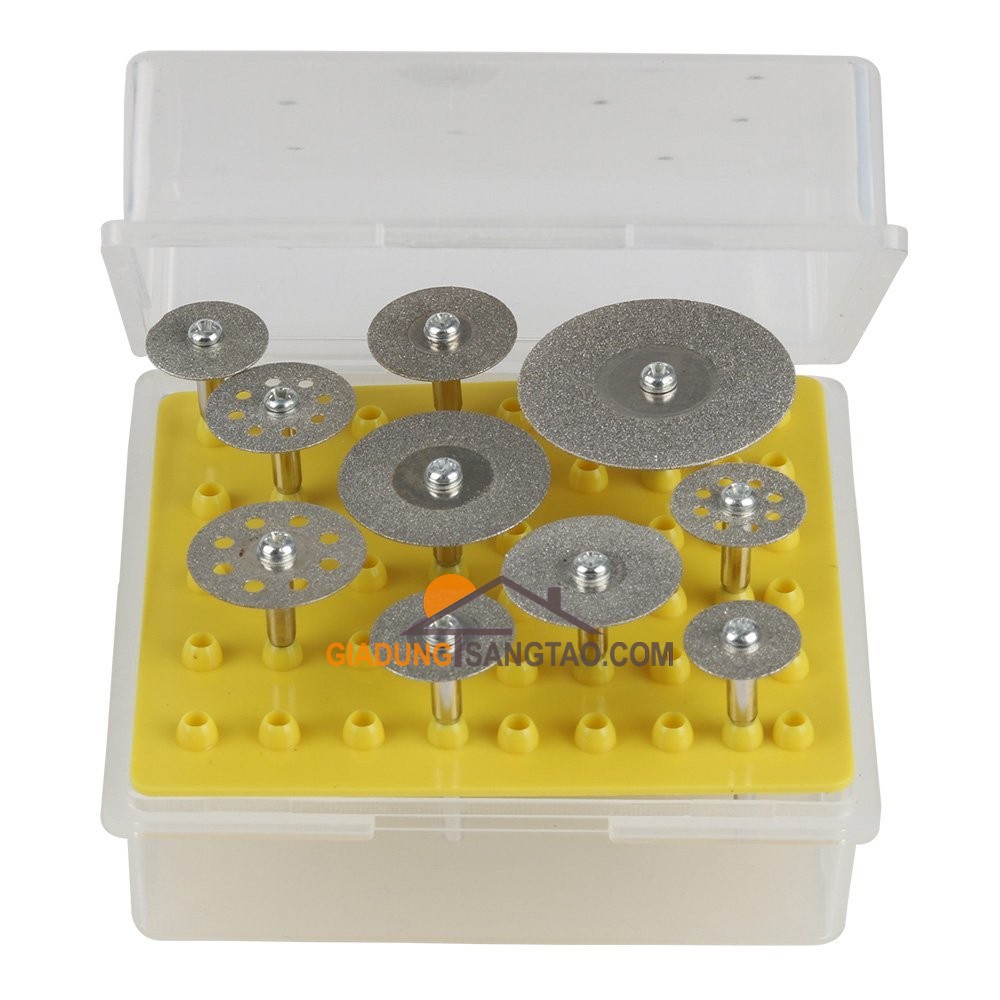 Hộp 10 lưỡi cắt kim cươngBộ 10 lưỡi cắt phủ kim cương, độ cứng cao, chịu mài mòn và va đập tốt, có thể dùng để cắt – mài – khắc đá, gốm, thủy tinh, ngọc bích, hợp kim cứng…