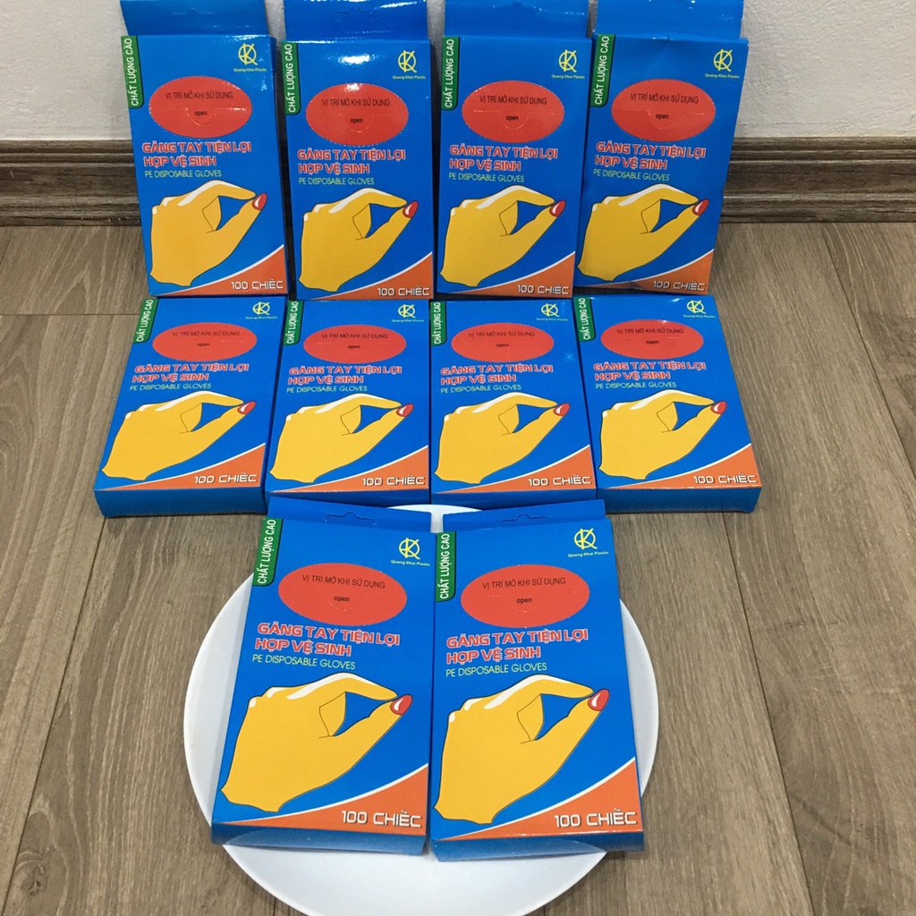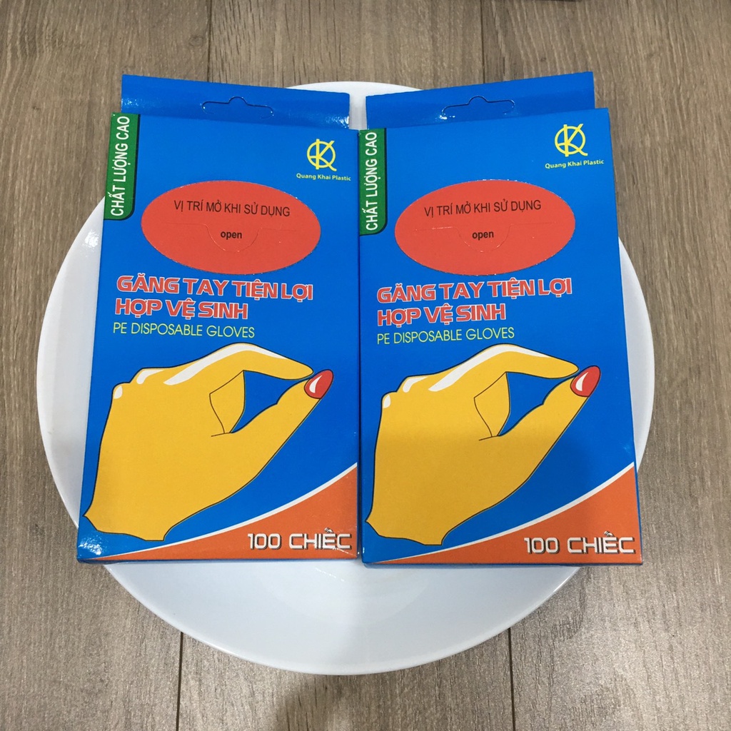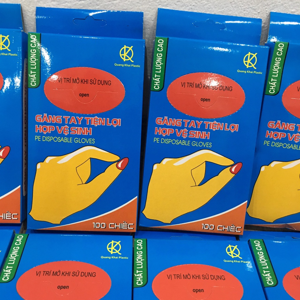 Hộp 100 chiếc găng tay Quang Khải là găng tay tiện lợi hợp vệ sinh chuyên dùng bảo vệ đôi tay của bạn khi làm các việc:1. Giặt tẩy chất dơ bẩn
