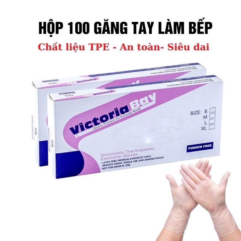 Hộp 100 gang tay nấu ăn nhà bếp an toàn, dễ sử dụngGĂNG TAY CAO SU VictoriaBAY trợ thủ đắc lực cho chị em khi làm các việc nhà không tên như nấu ăn, giặt giũ, rửa bát, lau dọn nhà cửa… một cách hiệu quả và tiết kiệm thời gian sức lực, bảo vệ da tay, tránh lây nhiễm vi khuẩn.