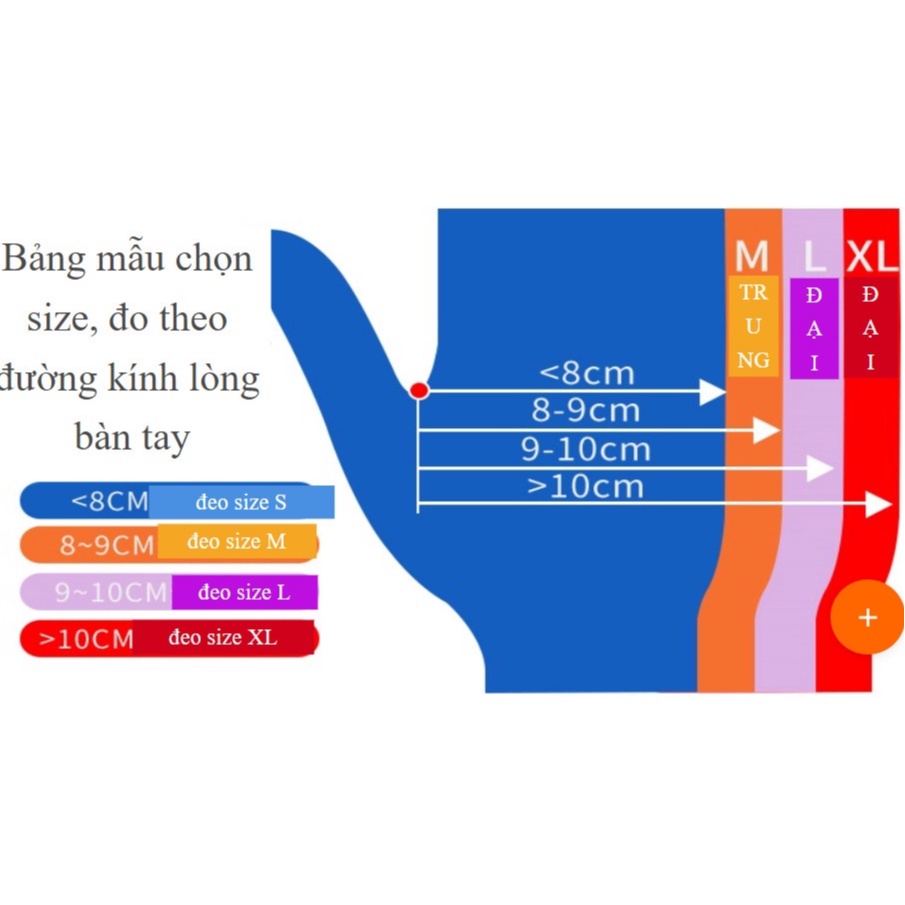 - Size: size S ( lòng bàn tay nhỏ hơn 8 cm), M (lòng bàn tay từ 8-9cm) , L ( lòng bàn tay từ 9-10cm)
