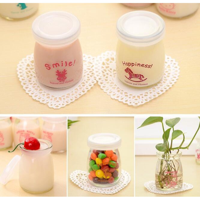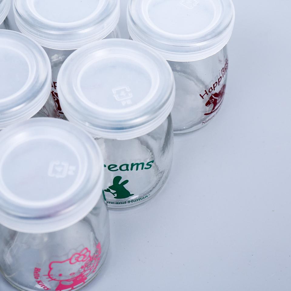 Sữa chua cho vào hũ thủy tinh mau mát lạnh và thơm ngon hơn.Thân hũ có in chữ và các hình hoạt hình đẹp mắt, dễ thương, cho bé luôn thích thú và hào hứng với món sữa chua, caramen ngon tuyệt.