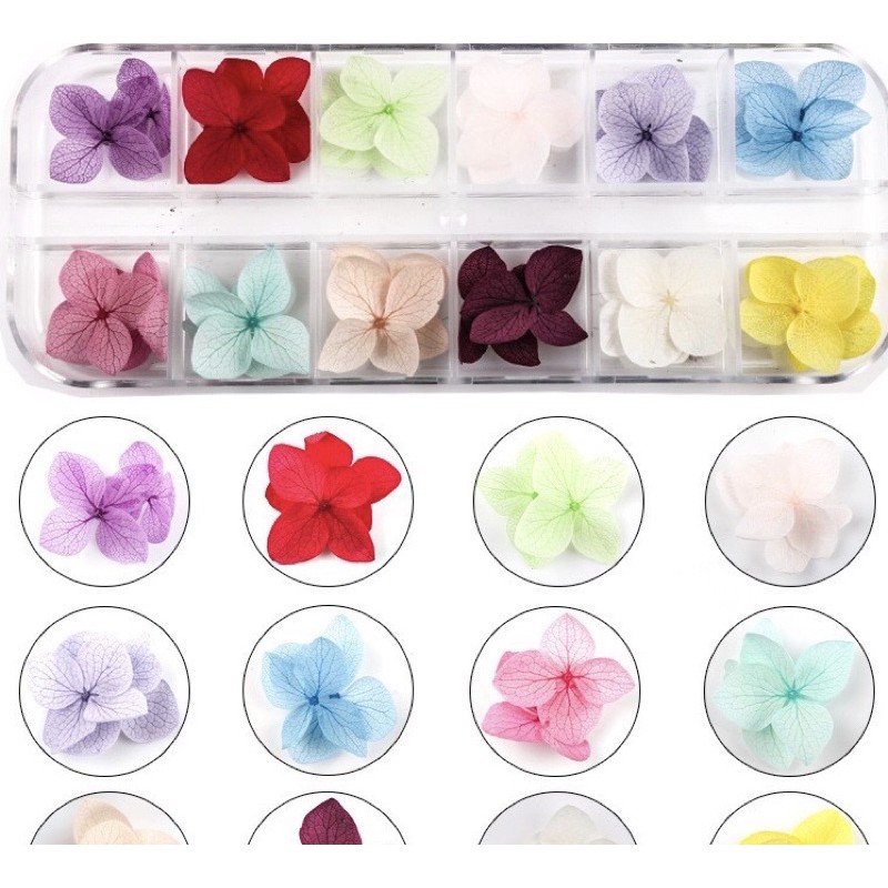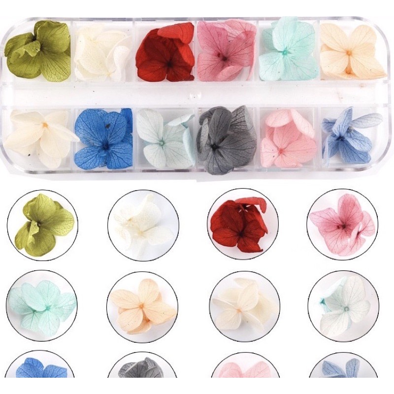 Hộp 12 màu hoa cẩm tú cầu khô màu sắc rực rỡ trang trí nữ trang resinSố lượng 24 bông, 12 màu