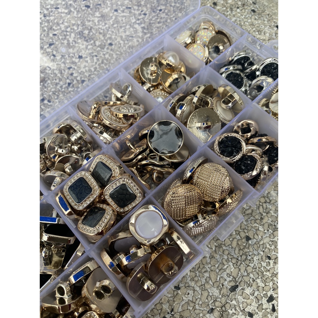 Hộp 150 nút 15 mẫu mỗi mẫu 10 nút đường kính từ 1.5 ->> 1.8CM sử dụng đơm kết áo váy siêu sangHộp nút 100% như hình