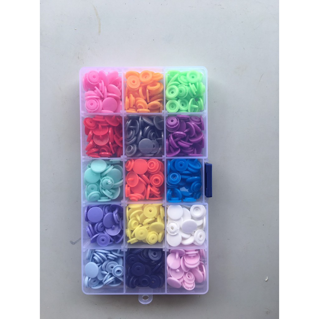 Hộp 150 nút nhwuaj 4 thành phần 15 màu khác nhau mỗi màu 10 bộ nút T5 tương ứng 13MM