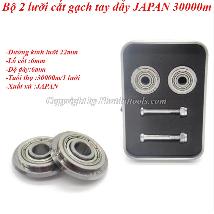 Bộ 2 lưỡi cắt gạch tay đẩy JAPAN 30000mBộ 2 lưỡi cắt gạch tay đẩy JAPAN 30000m là lưỡi cắt tròn như đồng xu,chuyên dụng lắp cho các dòng máy cắt gạch men tay đẩy,máy cắt gạch không bụi.Sản phẩm phù hợp với hầu hết các dòng máy trên thị trường Việt Nam.