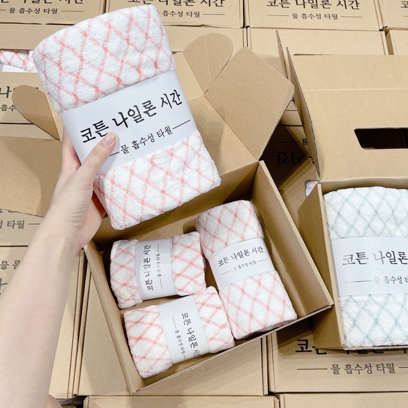 Nhà cửa & Đời sống > Đồ dùng phòng tắm > Khăn mặt, khăn tắm, áo choàng tắm > Khăn mặt || hộp 3 khăn tắm và khăn mặt bông cực sang (tặng 20/10)Còn hàng