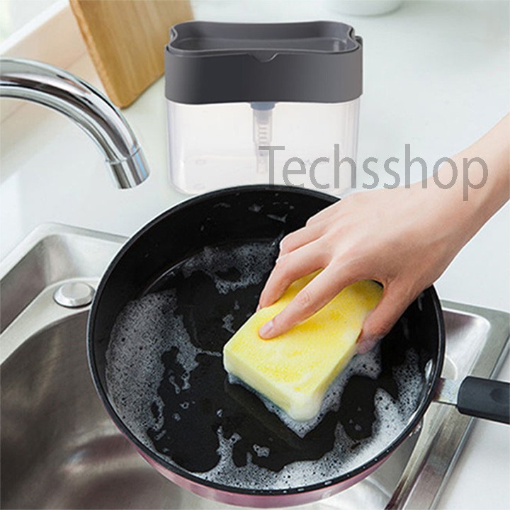 Dụng cụ tiện lợi 2in1, hộp vừa chứa dung dịch rửa và phía trên đựng giẻ, bọt biển rửa chén bát.