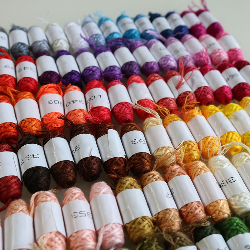 - 100 kén chỉ các màu đủ tông, mỗi kén kích thước 3x1 cm, dài 8m và gồm 6 sợi chỉ nhỏ có thể tháo ra cuốn vào suốt chỉ để tiện sử dụng