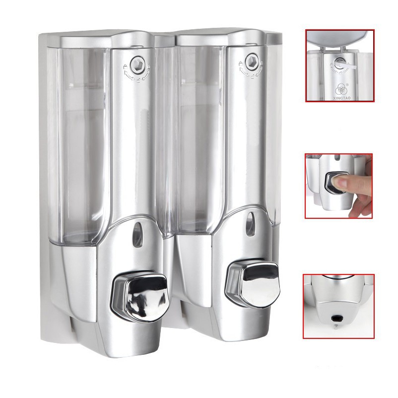 Giới thiệu Hộp chứa nước rửa tay, sữa tắm, dầu gội gắn tường loại đôi, màu trắng bạc
