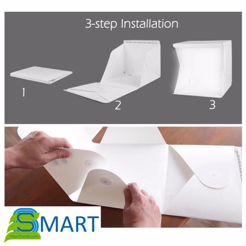 Tích hợp đèn LED 20 bóng kèm theo bộ sản phẩm có 2 phông nền đen và trắng để thay đổi cho phù hợp với sản phẩm khi chụp.