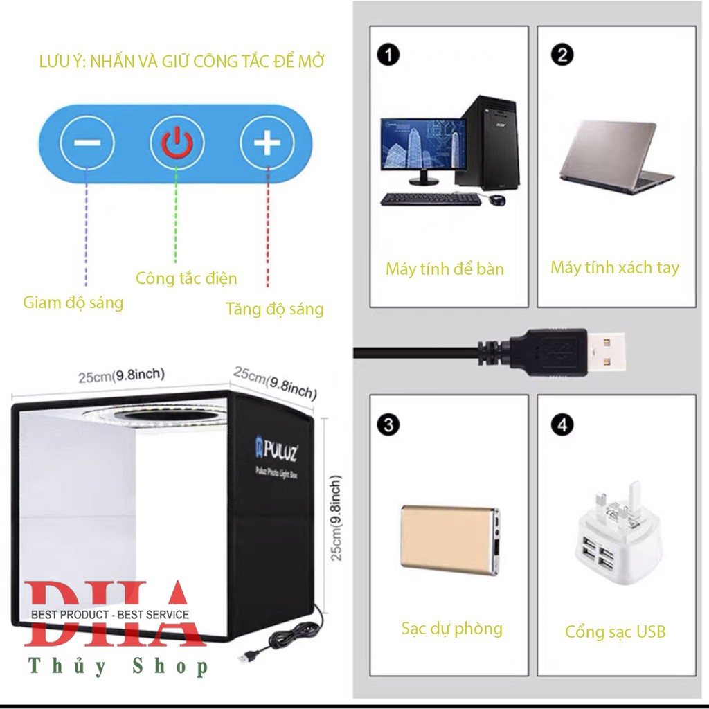 [CHÍNH HÃNG] HỘP CHỤP SẢN PHẨM PULUZ 25x25x25 TÍCH HỢP ĐÈN LED SIÊU SÁNGHộp Chụp Hình Sản Phẩm PULUZ giúp cho hình ảnh chuyên nghiệp hơn như chụp ở studio, hình ảnh có độ sáng cao, chất lượng tốt làm cho khách ra quyết định mua hàng nhanh chóng. Hãy sở hữu ngay Hộp Chụp Hình Sản Phẩm PULUZ để có được nhiều đơn hàng hơn ^^