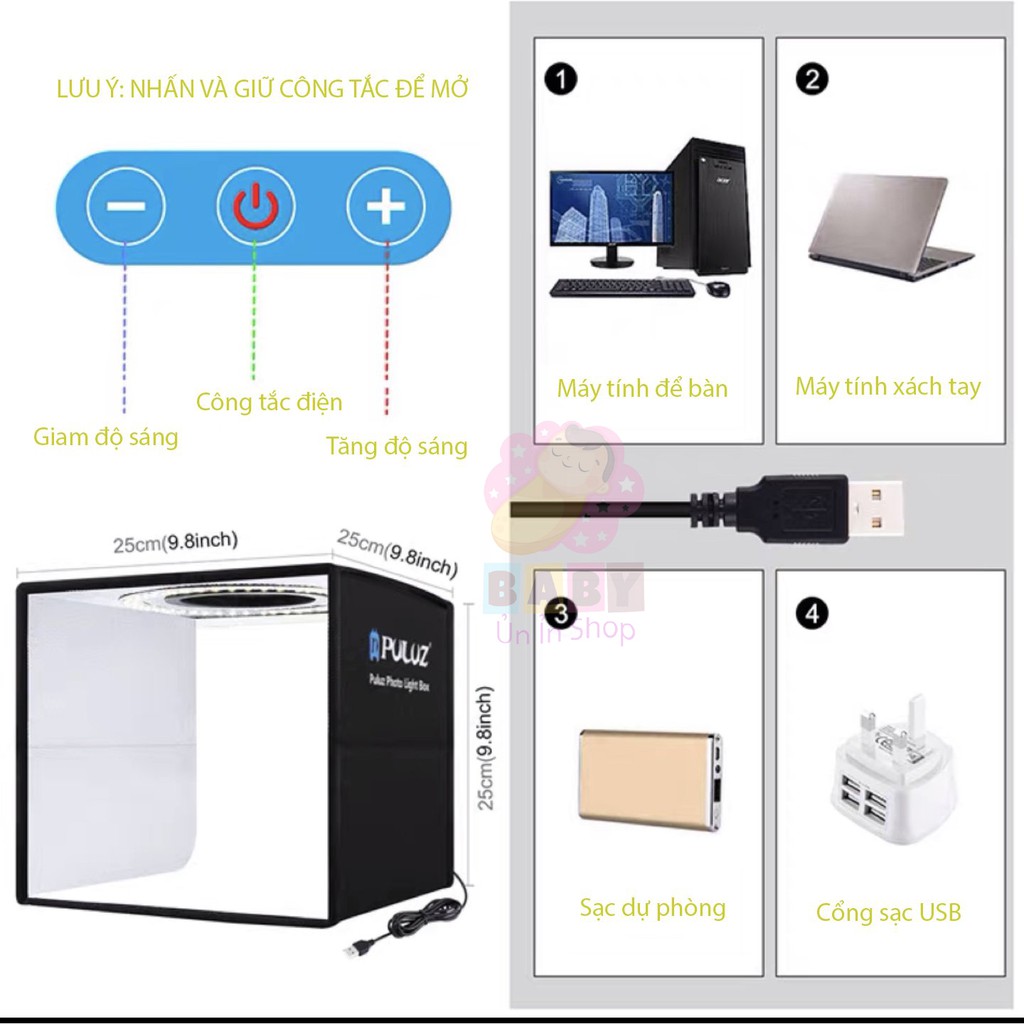 - Thích hợp: Studio nhỏ có thể nhanh chóng và dễ dàng chụp ảnh các mặt hàng nhỏ như đồ trang sức, phụ kiện, đồ chơi, đồng hồ, đồ dùng và các vật dụng khác.