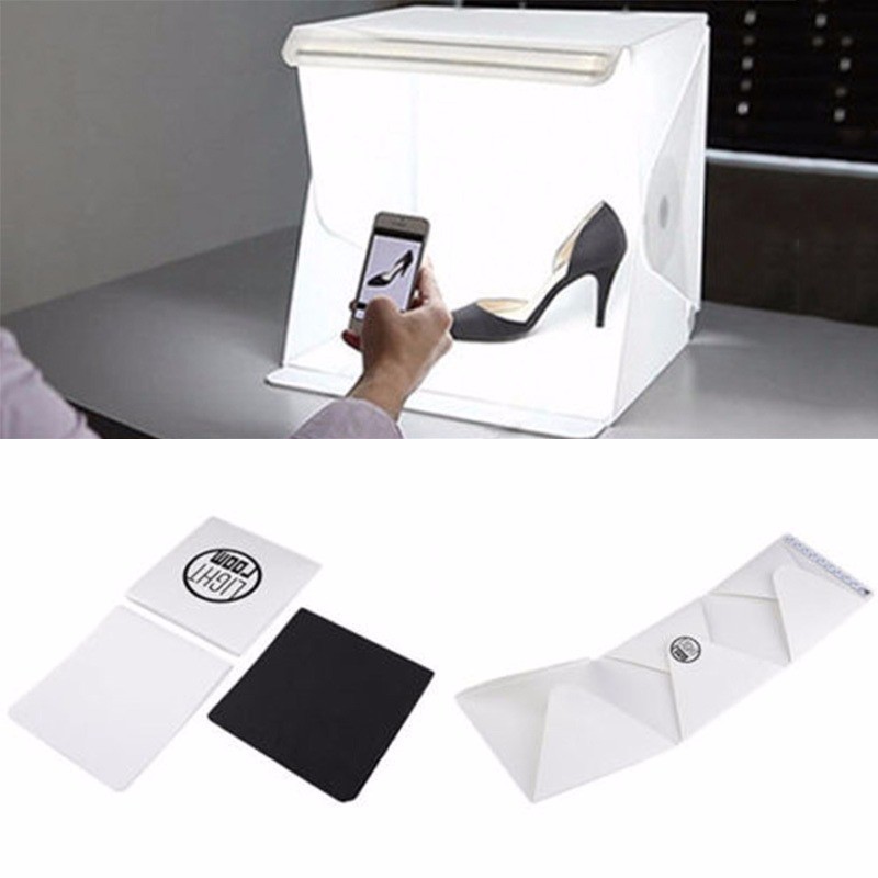 Hộp chụp sản phẩm( 30x30x30)tích hợp 2 dàn đèn led , kích thước hộp 40x40x40(cm) sẽ là 1 chọn lựa hoàn toàn đáp ứng nhu cầu cũng như túi tiền của bạn!Với bề ngoài rất nhỏ gọn, thiết kế để có thể gấp lại như 1 tập hồ sơ thì dù bất kỳ ở đâu bạn cũng có thể đem theo loại hộp chụp sản phẩm này. Được làm hoàn toàn bằng Polymer nhựa tổng hợp hết sức chắc chắn và bền, Hộp chụp ảnh sản phẩm có đèn ( 30x30x30)(cm) hoàn toàn thích hợp để bạn có thể chụp được hơn 70% các mặt hàng bán online.
