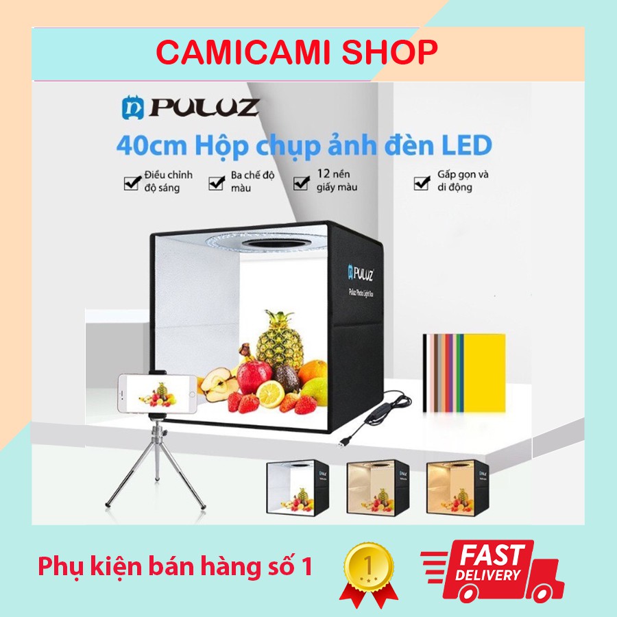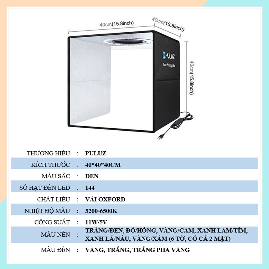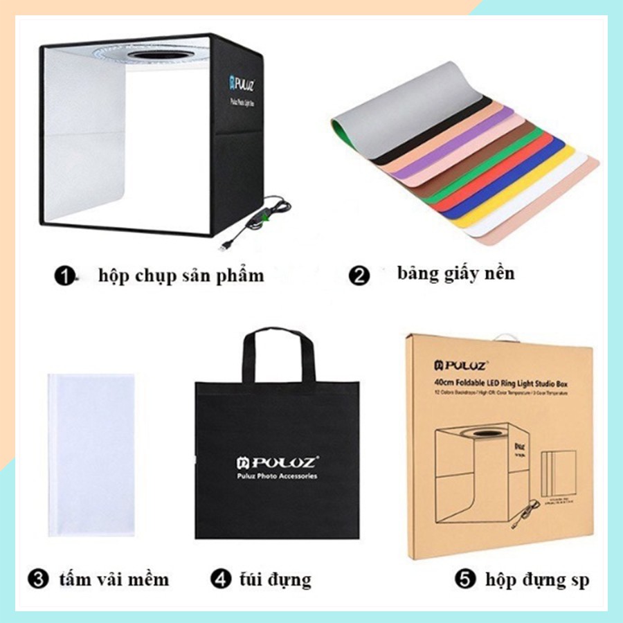 Hộp chụp hình sản phẩm 40x40 Puluz hộp chụp ảnh sản phẩm siêu sáng 12 phông nền