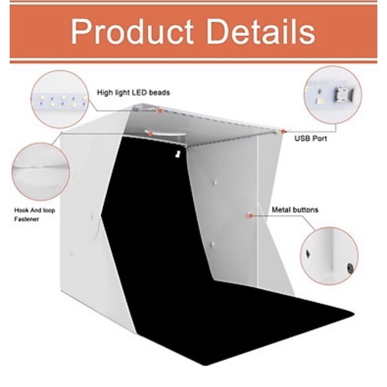 Hộp chụp sản phẩm nhỏ gọn với kích thước 40x40cm,tiện dùng cho người hay di chuyển, các cửa hàng hoặc shop có diện tích nhỏ. Chất liệu sản phẩm bằng nhựa tốt có thể lau khi bám bẩn, tích hợp 2 thanh đèn led ánh sáng trắng chuẩn studio với 35 bóng mỗi dây. Đèn led có thể dùng nguồn từ pin dự phòng hoặc cục sạc của các máy điện thoại, máy tính bảng. Sản phẩm phù hợp cho các cửa hàng, Shop bán đồ chơi, giày dép, sản phẩm công nghệ hay quà tặng …. Với hộp chụp sản phẩm với đèn led này bạn có thể không cần phải dùng tới máy ảnh cao cấp mà chỉ cần chiếc điện thoại thông minh mà bạn sẵn có cũng có thể cho ra những tấm hình đẹp