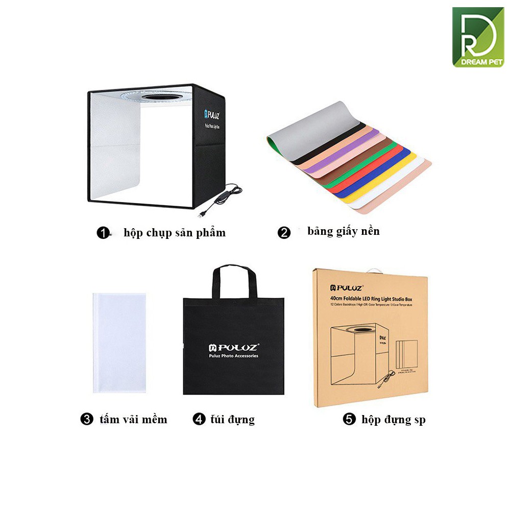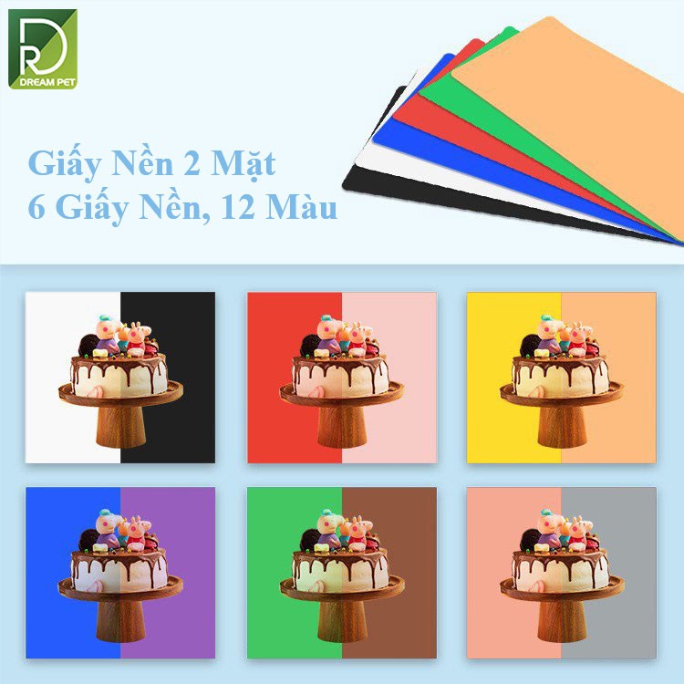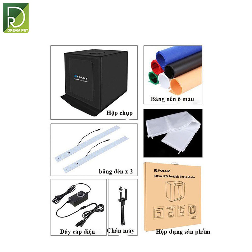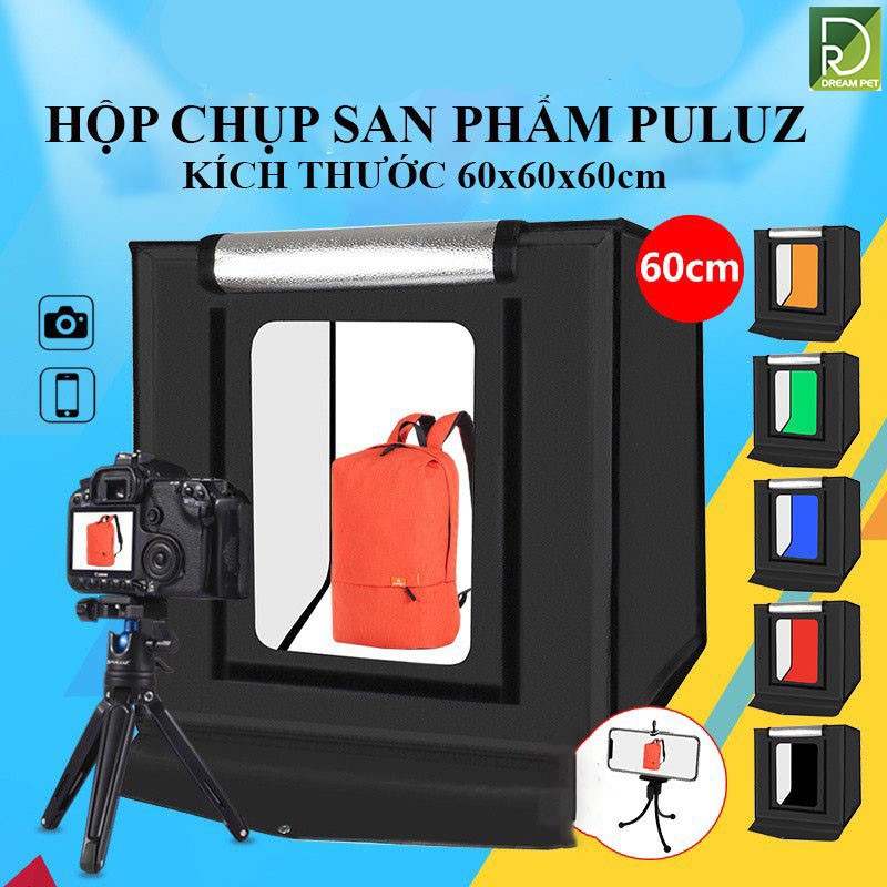 Thương hiệu: Puluz Nhiệt độ màu: 5500k Phông chụp với 6 màu: trắng, đen, cam, xanh lá , xanh dương , đỏ Kích thước: 60 x 60 cm