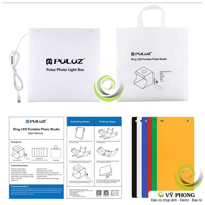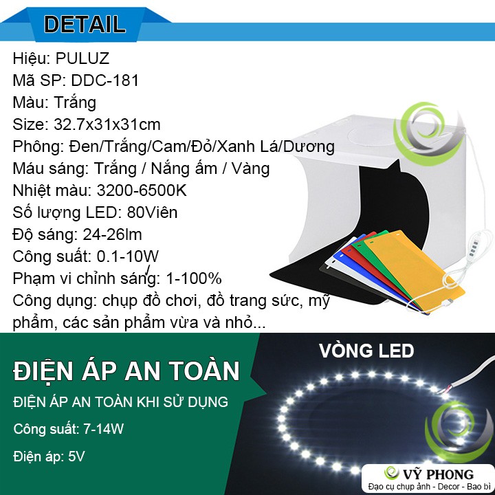 Giới thiệu HỘP CHỤP SẢN PHẨM PULUZ ĐÈN LED VÒNG TRÒN 3 MÀU USB 32.7x31x31CM TẶNG 6 TẤM PHÔNG MÀU DDC-181