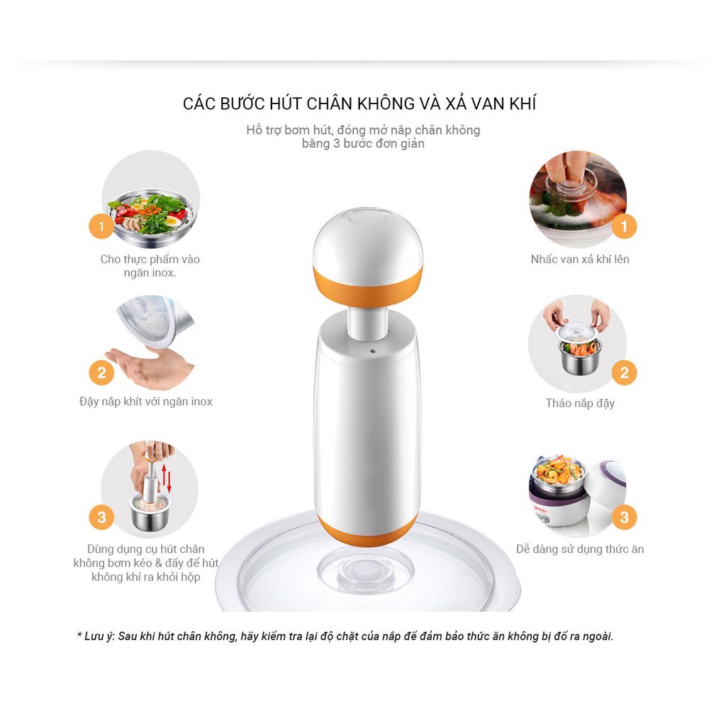- Có dụng cụ hút chân không dùng để hút không khí đảm bảo thức ăn tươi ngon hơn đồng thời giúp nắp chặt chống rơi nước và thức ăn ra ngoài, ngăn chặn vi khuẩn và không bị ám mùi