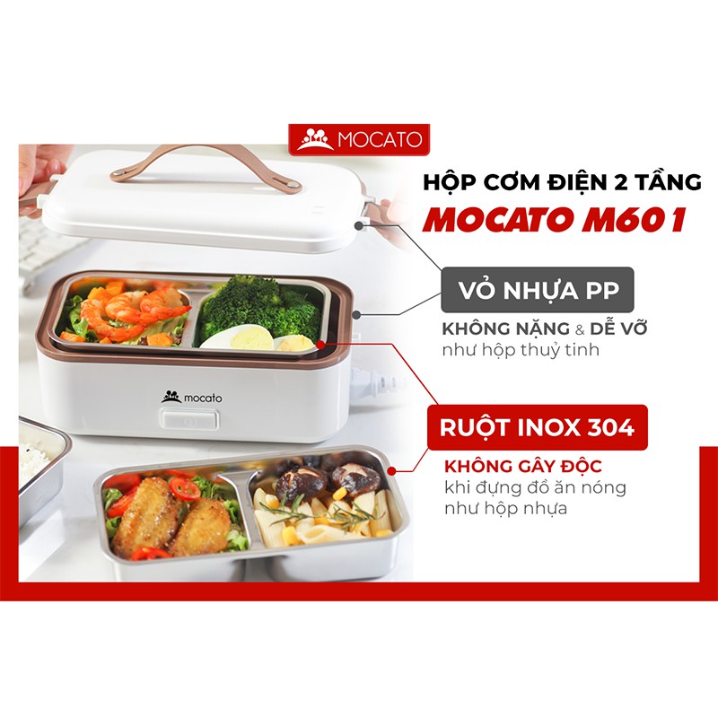 Hộp đựng cơm cắm điện 2 tầng Chính hãng MOCATO M601 lõi inox 304 cao cấp, có thể nấu trực tiếp cơm và thức ăn cho bữa trưa văn phòng tiện lợi, an toàn.* Bảo hành chính hãng 12 tháng.