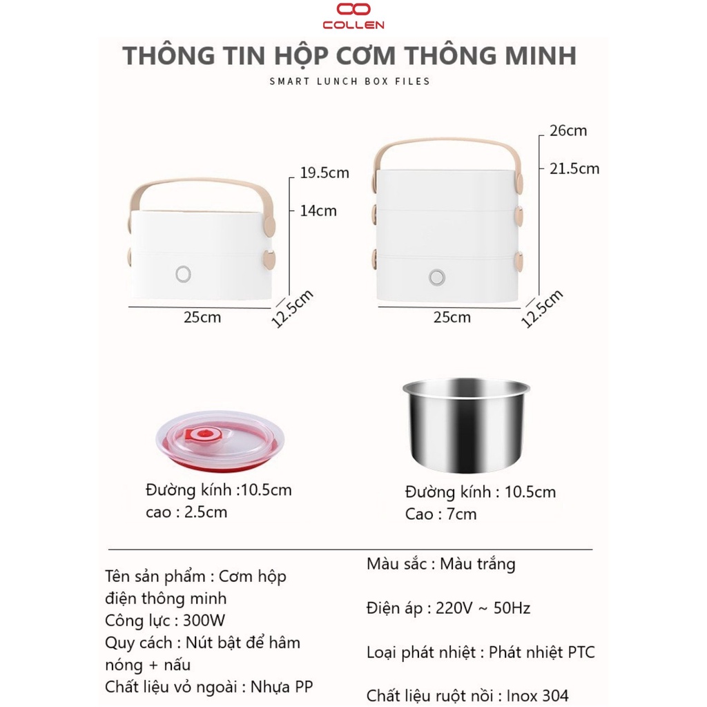 1. Thông tin sản phẩm hộp cơm cắm điện văn phòng 2 tầng 4 ruột nồi inox có thể nấu ăn, giữ nhiệt, hâm nóng, hộp cơm 6in1 COLLEN LIFE- Kích thước