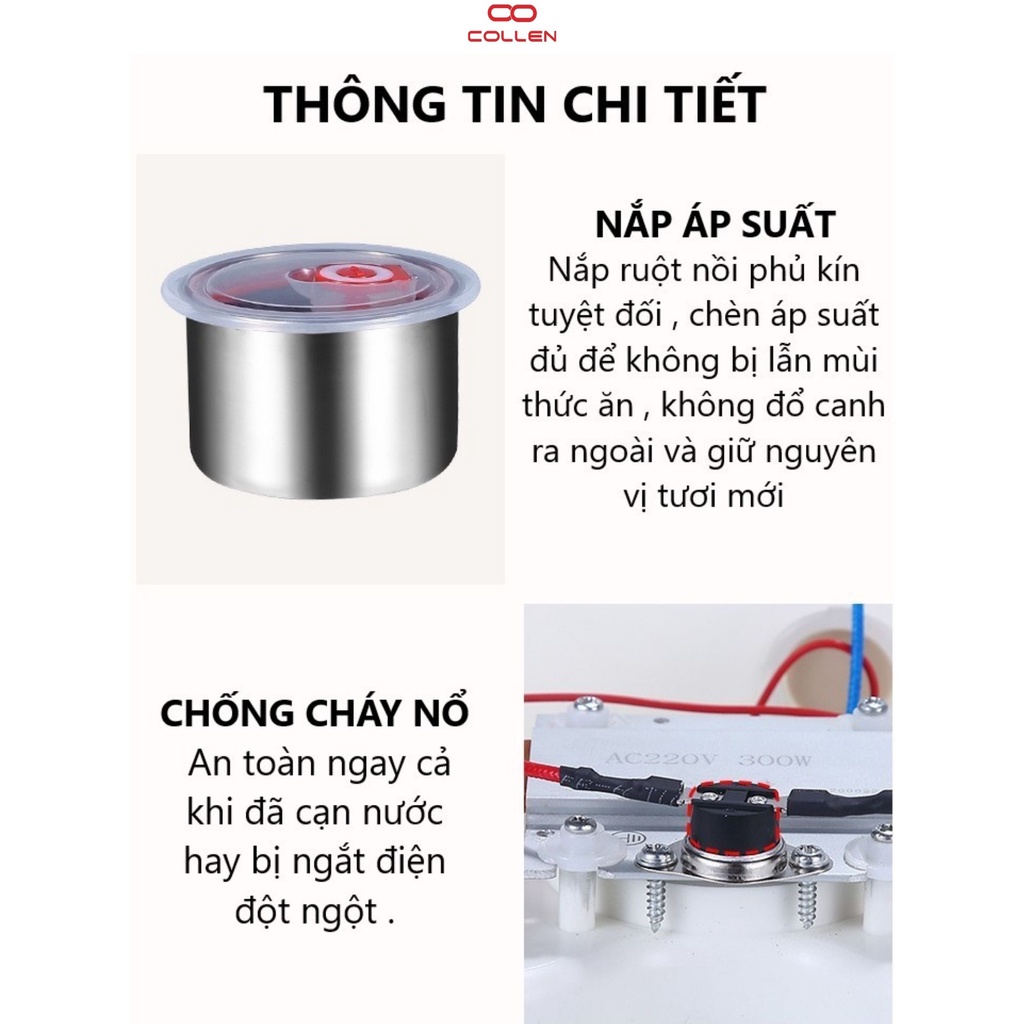 2. Chức năng sản phẩm : Hộp cơm cắm điện văn phòng 2 tầng 4 ruột nồi inox có thể nấu ăn, giữ nhiệt, hâm nóng, hộp cơm 6in1 COLLEN LIFE