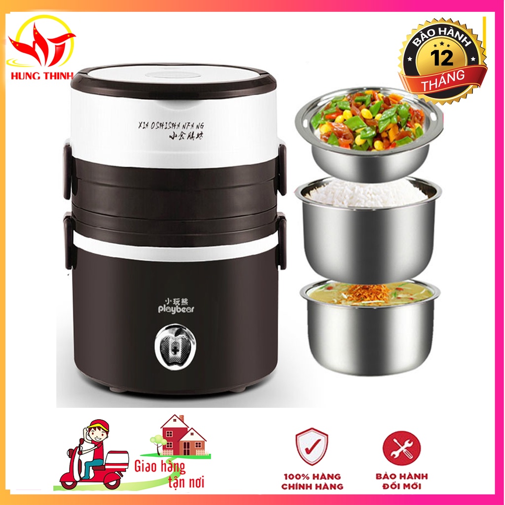 Hộp cơm hâm nóng cắm điện inox 3 tầng Playbear