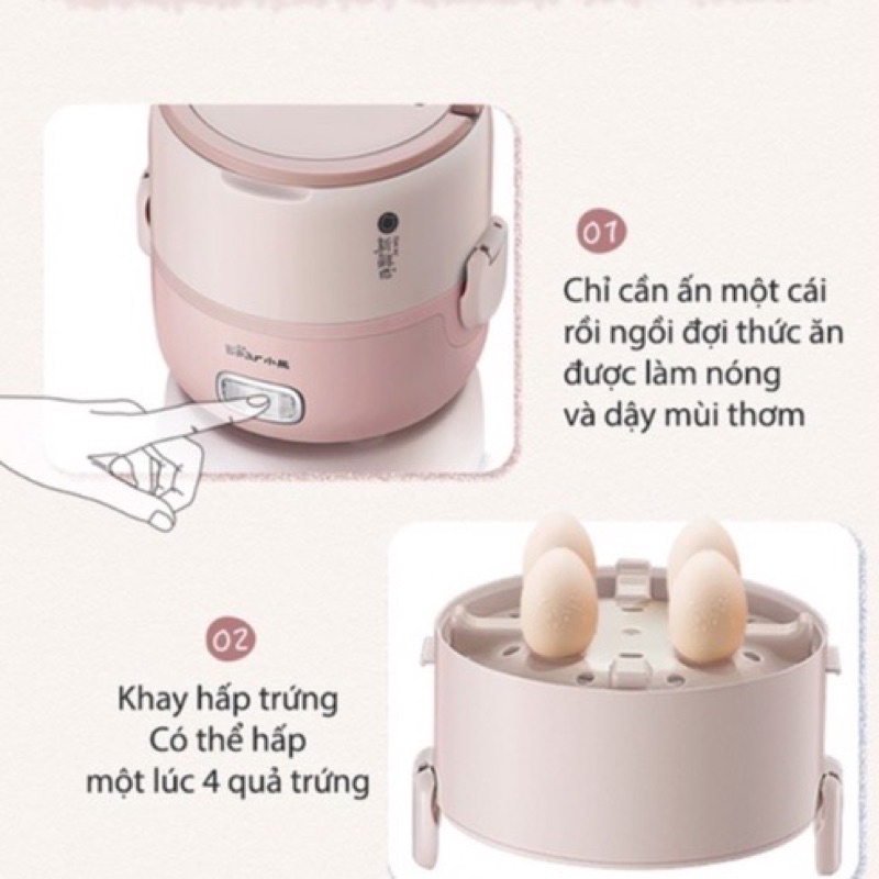Hộp cơm điện cầm tay đa năng Bear DFH-B20S6 là sản phẩm giải cứu dân văn phòng khỏi cảnh mỗi khi đến giờ trưa đều phải suy nghĩ hôm nay ăn gì?Bởi chỉ cần chuẩn bị thức ăn sẵn vào buổi sáng và cho vào hộp khi đến giờ ăn chỉ cần cho thêm nước, cắm điện và chỉ vài phút sau là đã có ngay bữa ăn nóng sốt, ngon miệng và nhất là đầy đủ dinh dưỡng.