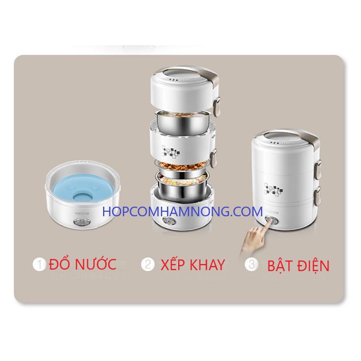 - Đổ cốc nước xuống đáy hộp cơm đặt các khay inox không đậy nắp vào và xếp lại đậy nắp hộp cắm điện và bật công tắc chờ kết quả nhanh chóng
