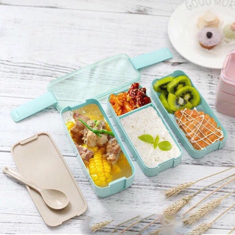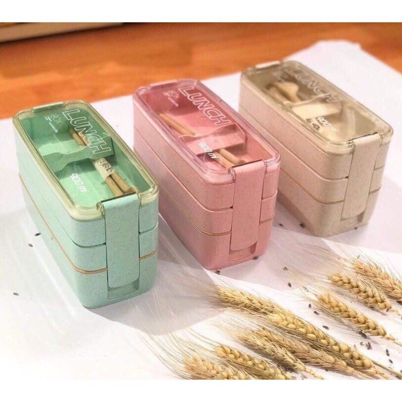 hộp cơm lúa 3 tầng hình chữ nhật kèm muỗng nĩa