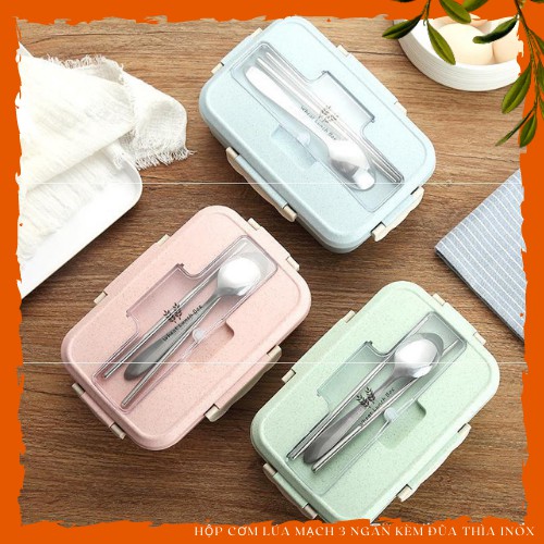 Hộp Cơm Lúa Mạch 3 Ngăn Kèm Đũa Thìa Inox - Giao Màu Ngẫu Nhiên------------------------------------