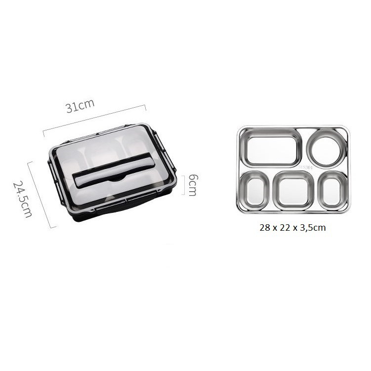 - Kích thước hộp nhựa đựng bên ngoài : 31cm*24,5cm*6,5cm ,kích thước khay inox 5 ngăn bên trong : 28 x 22 x 3,5cm