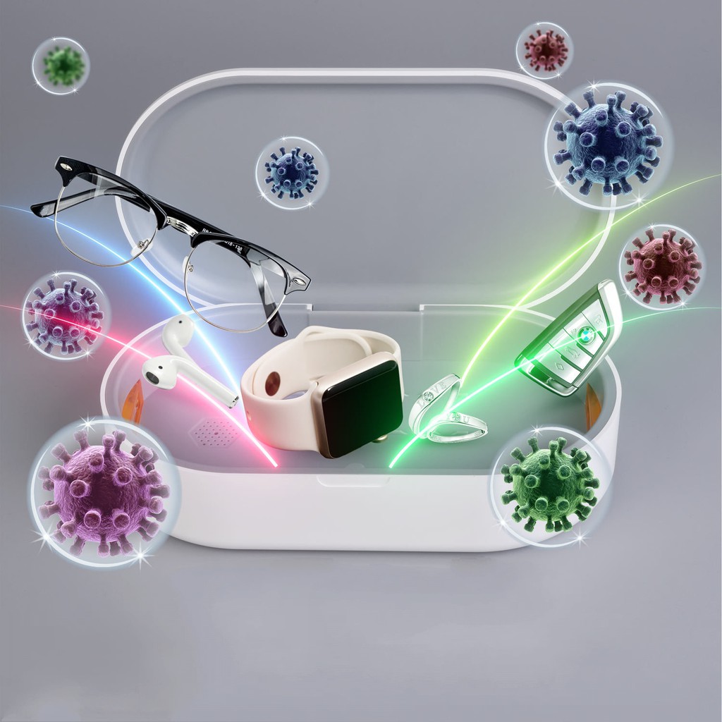 Hộp Diêt Khuẩn Khử Trùng Kép UVC-Ozone tích hợp sạc không dây 15W Đa năng dùng cho điện thoai, khẩu trang, trang sức, tai nghe, mắt kính,...và nhiều vật dụng khác.Đèn khử trùng sử dụng 2 cơ chế khử khuẩn gồm tia cực tím UVC và hệ thống ống kép phát tán ozone. Trong đó Ozone là 1 hợp chất có khả năng oxy hóa mạnh, có thể làm suy giảm các sinh vật gây bệnh như vi khuẩn, phân huy và khử trùng hoàn toàn. Tính năng khử trùng bằng tia cực tím còn lại sẽ tiêu diệt vi khuẩn và virus bằng cách phá hủy các ADN và ARN của chúng, ngăn khả năng sinh sản cũng như các chức năng lây nhiễm. Chỉ sau 5-10 phút làm việc, đèn cho hiệu quả khử trùng nhanh và chính xác đến 99.9%.
