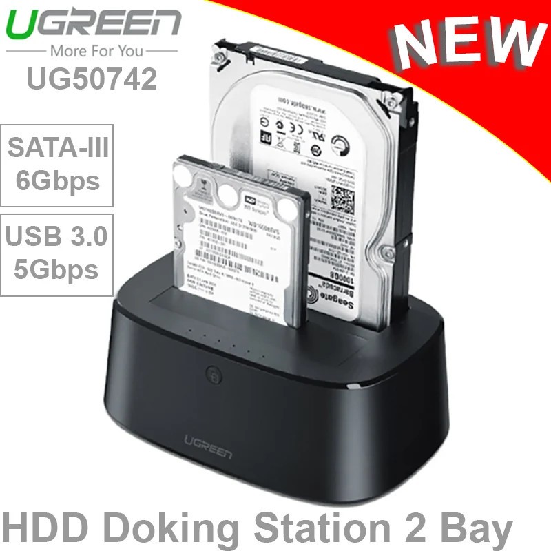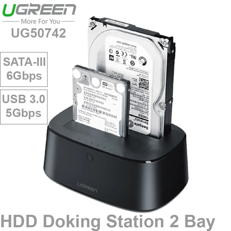 Docking HDD/SSD 2 Khay SATA 2.5/3.5" Hỗ trợ 16TB, Tốc độ UASP 6Gbps Ugreen 50742Docking dữ liệu ổ cứng SATA HDD/SSD USB 3.0 Ugreen 50742 là phụ kiện giúp đọc và ghi giữ liệu từ ổ cứng với máy tính hỗ trợ truy xuất cùng lúc 2 ổ cứng SSD và HDD dung lượng lên đến 16TB với tốc độ lên đến 5Gbps cho kết nối USB 3.0 và hỗ trợ công nghệ UASP giúp tăng tốc độ truyền tải lên đến 6Gbps (Chú Ý: UASP là chỉ có sẵn cho WIN8 Mac OS 8&9).