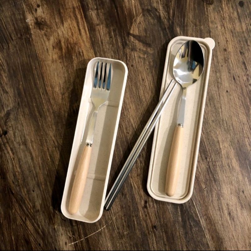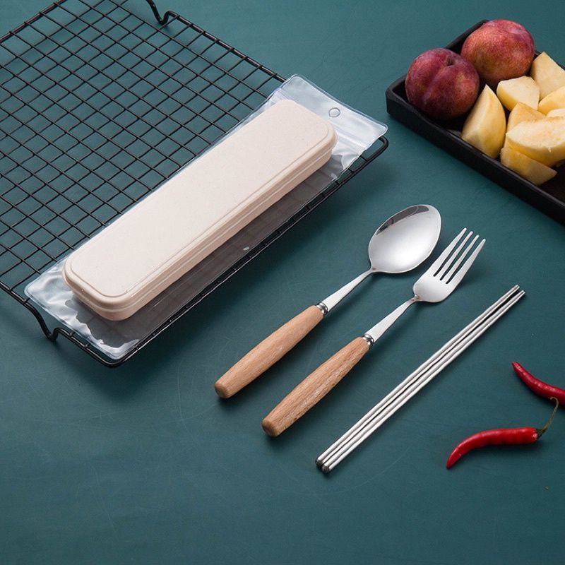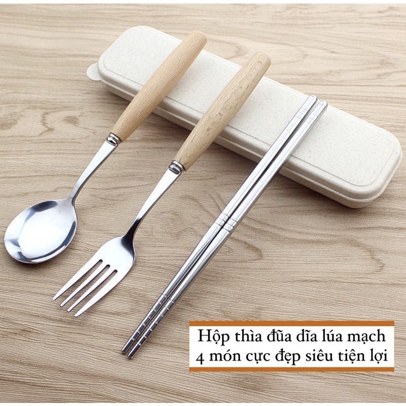 Hộp đũa lúa mạch thìa dĩa inox cán gỗ 4 món