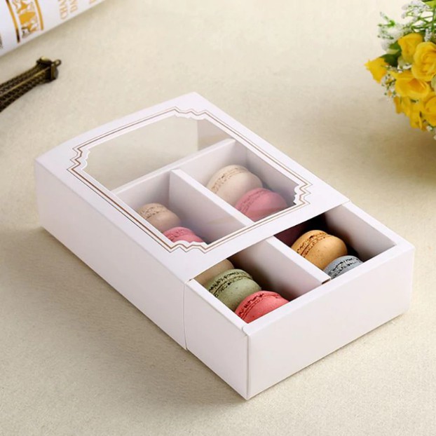 Hộp đựng bánh macaron sang trọngHộp có vách ngăn bên trong để đặt từng bánh.