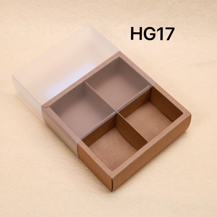 1 bộ hộp bao gồm: 1 nắp mica mờ, 1 đáy hộp giấy màu nâu, 2 thanh chia.