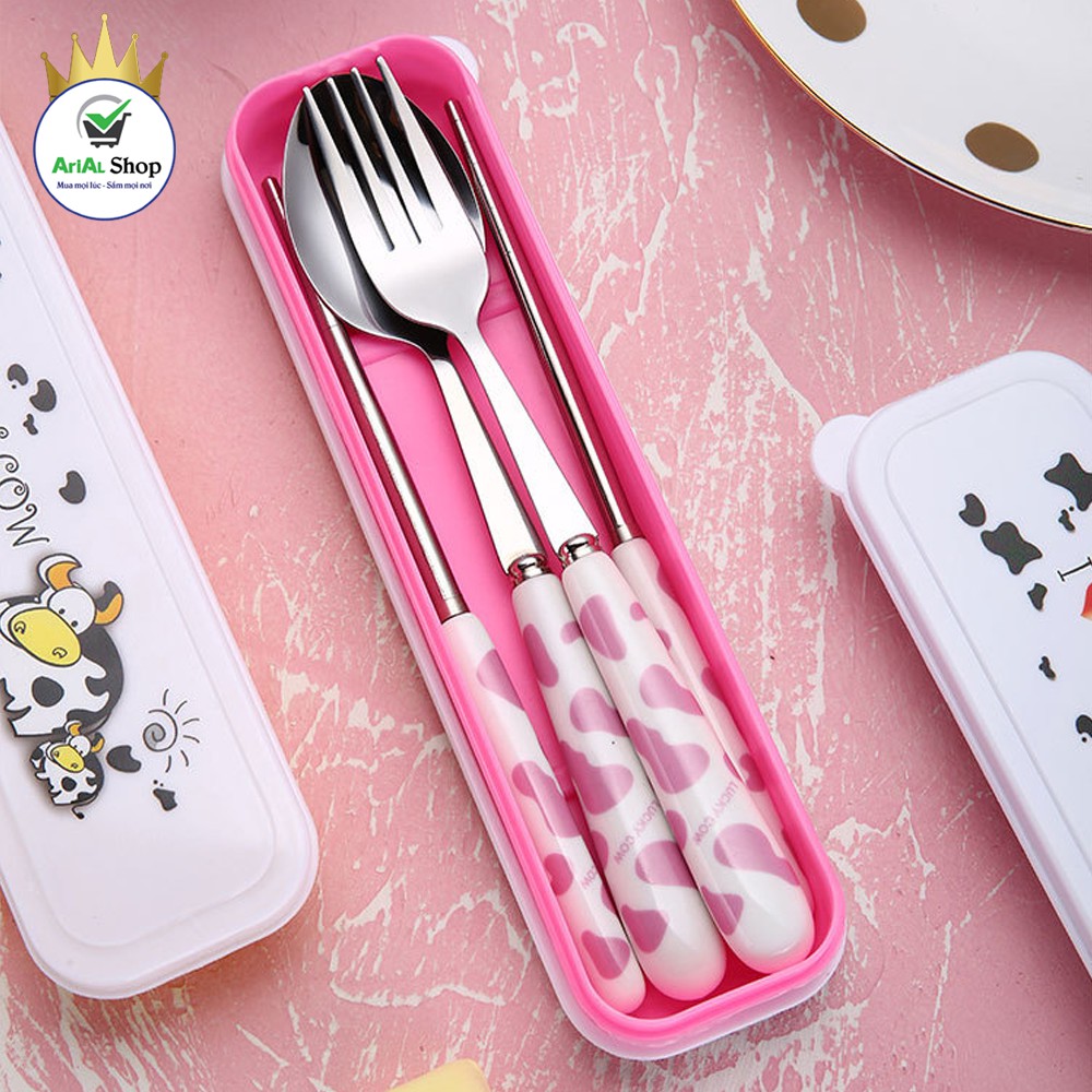 [HCM] Bộ Đũa Thìa Dĩa Inox SUS 304 Cán Sứ Cách Nhiệt Với Hộp Đựng Họa Tiết Bò Sữa