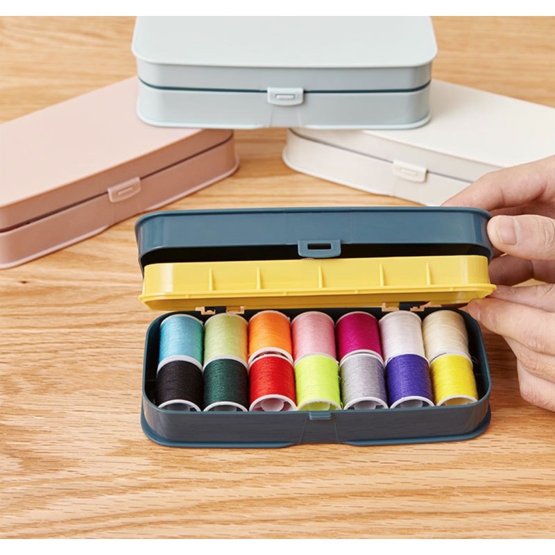 Hộp dụng cụ may vá gồm 14 cuộn chỉ khác màu, kim khâu, kéo, thước dây, dụng cụ xỏ kim,và nhẫn bảo vệ ngón tay- Chỉ bền màu, sợi dai chắc, bền màu, màu đẹp, không xù hay xơ chỉ ....