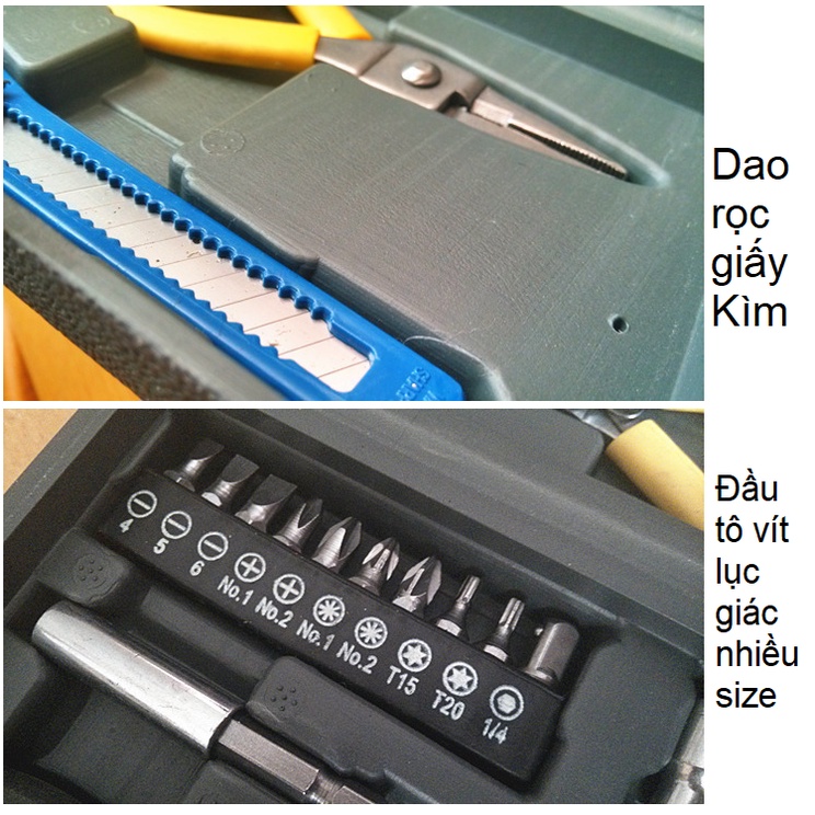 - Bộ dụng cụ bao gồm 1 kềm, 1 dao, 1 vít, 1 đầu nối tua vít, 14 đầu vít và 6 tua vít nhỏ.