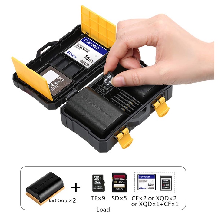 Đựng được 2 pin + 2 CF( XQD) + 5 SD + 9 MicroSD (TF)