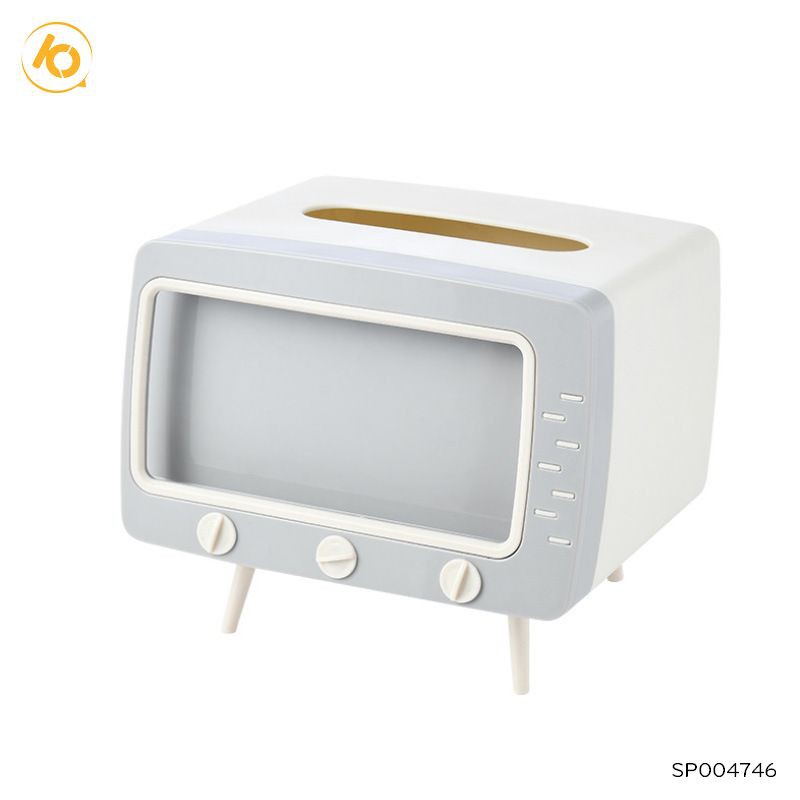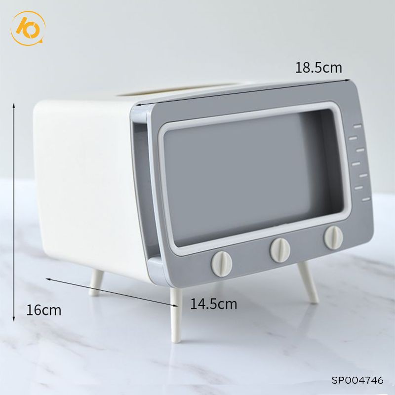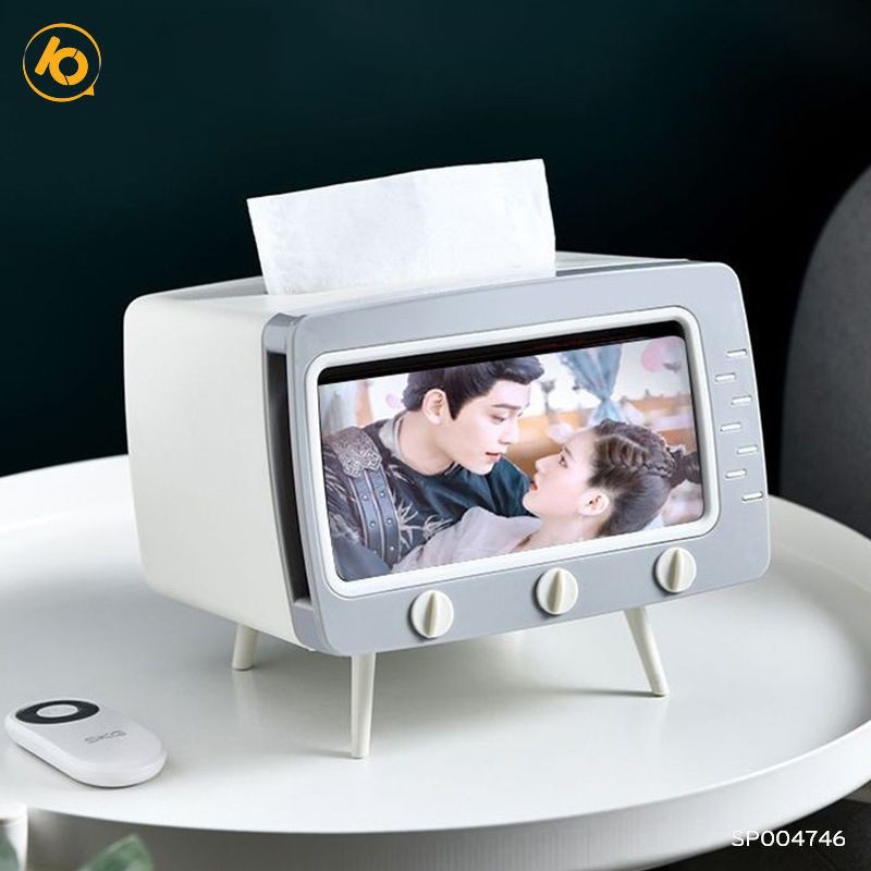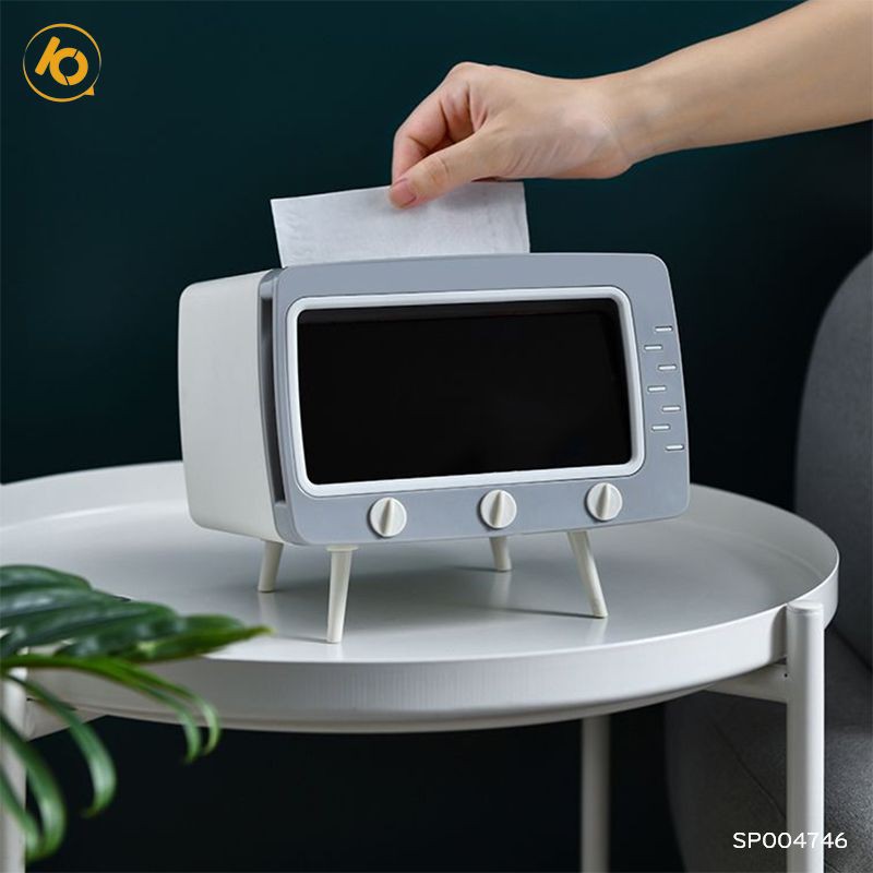 - Hộp đựng giấy ăn hình ti vi để bàn, tích hợp cùng giá đỡ điện thoại giúp bạn thoải mái vừa xem phim vừa rảnh tay làm những công việc mình ưa thích