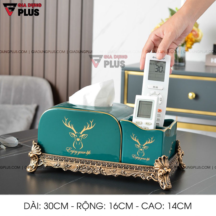 - Hộp giấy đặt bàn sứ xanh ngọc với biểu tượng nai sừng tấm quý tộc theo phong cách Bắc Âu là lựa chọn tối ưu trong - việc vừa đựng giấy đa năng vừa là sản phẩm trang trí tạo nét sang trọng cho phòng khách & bàn ăn nhà bạn.