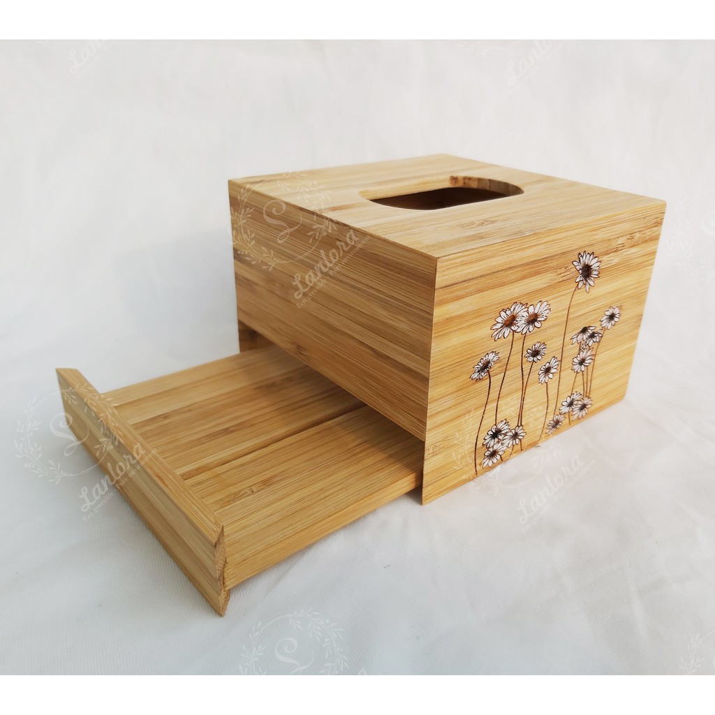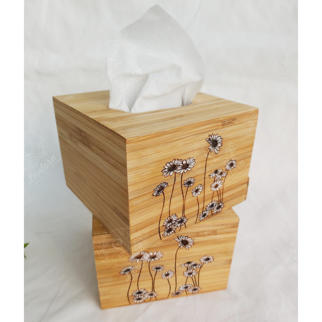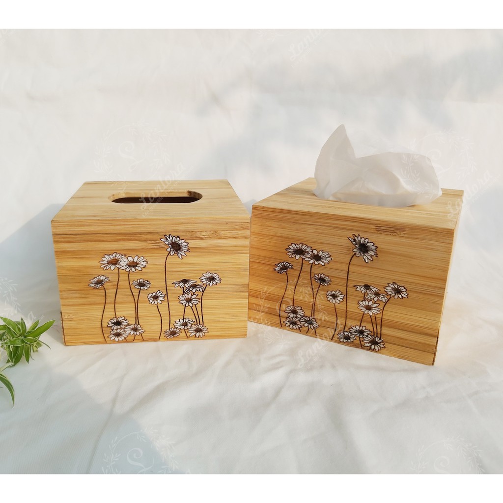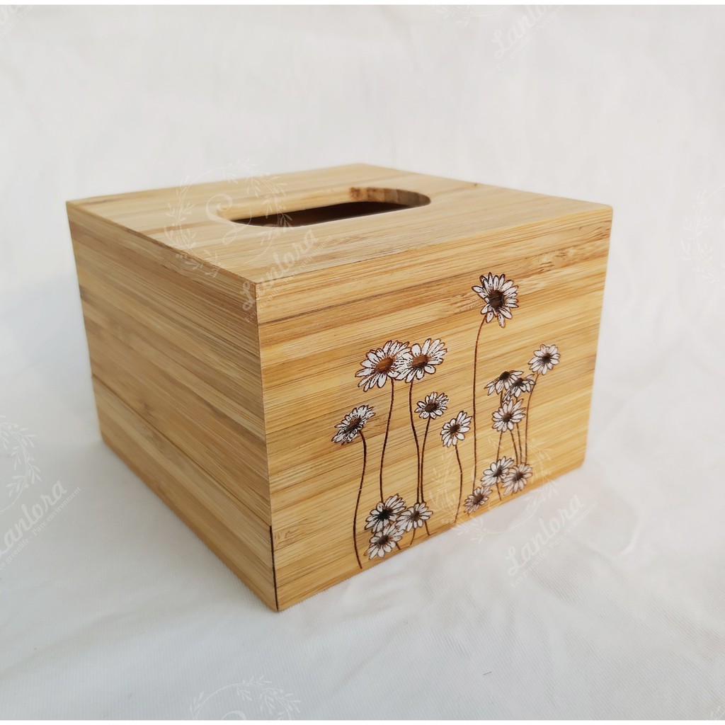 Nhà cửa & Đời sống > Trang trí nhà cửa > Khăn trải bàn || Hộp đựng giấy ăn để bàn bằng tre trang trí hoa cúc daisy phủ dầu thực vật, sản xuất tại Việt NamCòn hàng
