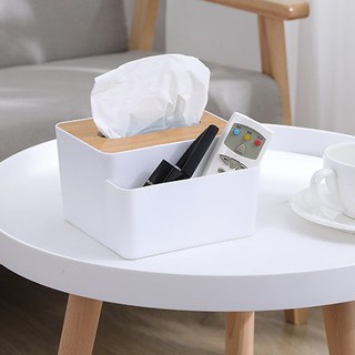 Hộp đựng giấy ăn để bàn nắp gỗ có ngăn để đồ đa năng, decor trang trí