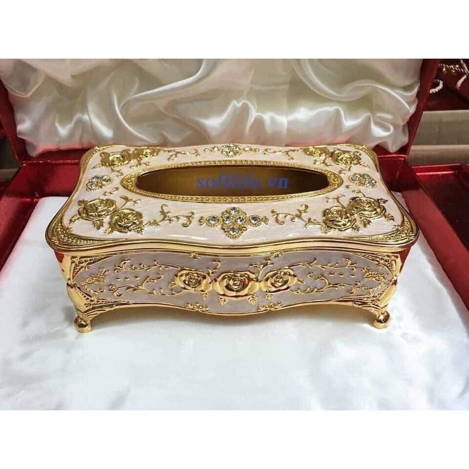 - Hộp đựng giấy ăn được trang trí hoa văn tinh xảo mang tính nghệ thuật cao mang phong cách cổ điển Châu Âu.