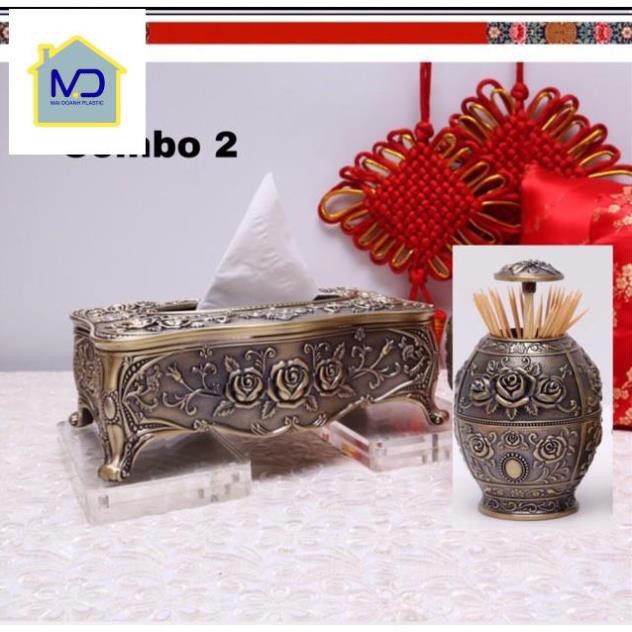 Hộp đựng giấy ăn + lọ tăm mạ đồng giả cổ