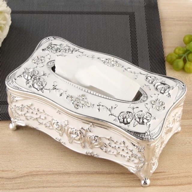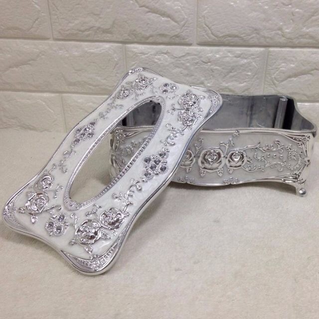 - Hộp đựng giấy ăn hợp kim được trang trí hoa văn tinh xảo mang tính nghệ thuật cao mang phong cách cổ điển Châu Âu.