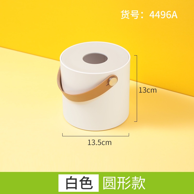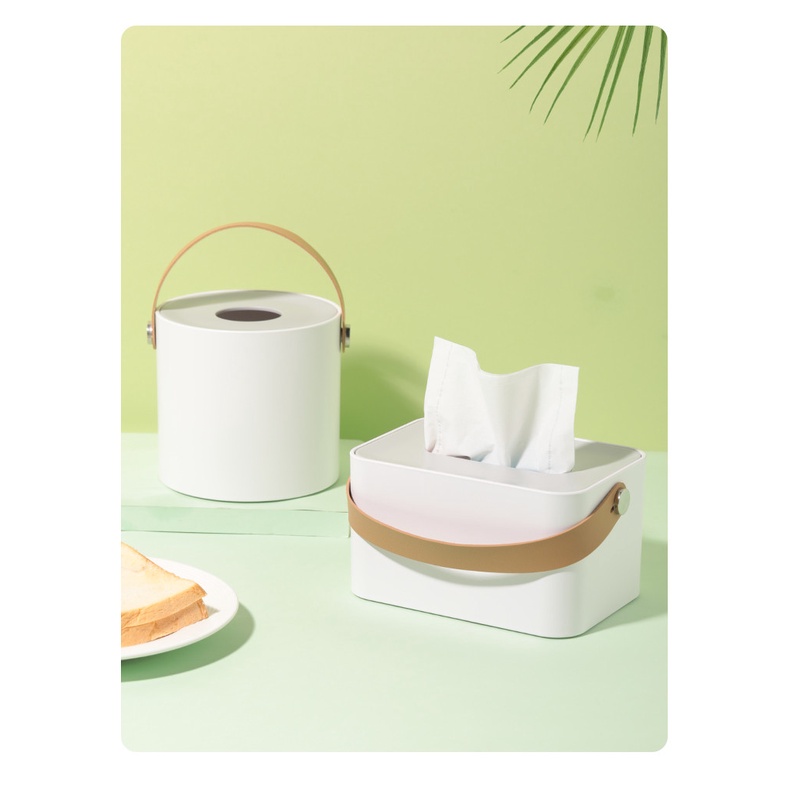 Hộp đựng giấy ăn tròn có quai xáchMàu sắc: chỉ có hộp thân màu trắng, nắp màu bạc