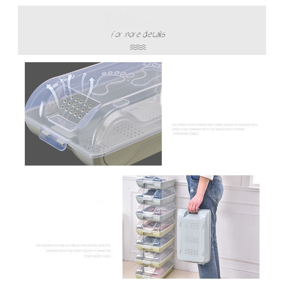 • Hộp đựng giày được trang bị khóa gài chắc chắn với thiết kế đặc biệt bạn có thể dễ dàng mở nắp hộp chỉ với một vài thao tác đơn giản. Nắp hộp sẽ không bị bật ra khi có những va chạm mạnh giúp bảo quản các đôi giày dép của bạn một cách an toàn và hiệu quả đồng thời tránh được bụi bẩn tối đa.